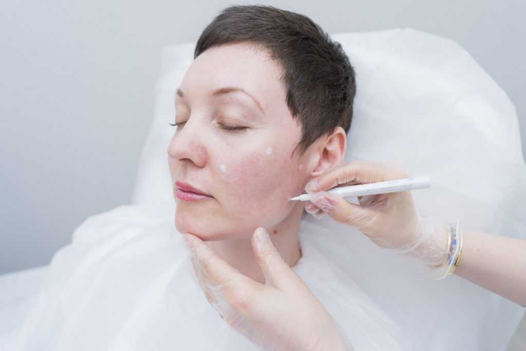 - Обработка кожи антисептическим раствором и разметка области введения состава.