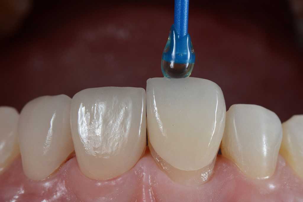 Преимуществом керамических изделий является то, что после протравливания и силанизации можно просто приклеить пластину и получить надежный результат. Благодаря адгезивной фиксации происходит надежное сцепление материала с тканями зуба и они становятся одним целым.