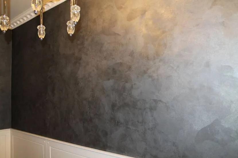 - Жатый шелк получается, если поверх основного слоя нанести еще один слой покрытия с помощью неравномерных движений. Для этого действия можно применять губку. По прошествии 20 минут поверхность необходимо выровнять шпателем.