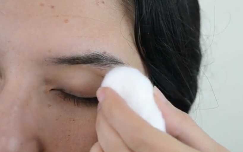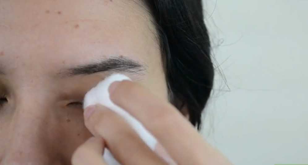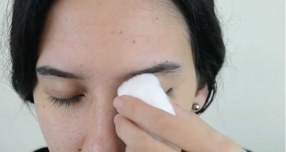 Шаг 2. Далее снимается, как и в предыдущем случае, декоративная косметика с области глаз. Делается это ватным тампоном, смоченным в составе для удаления мейкапа. Тушь также не удаляется.