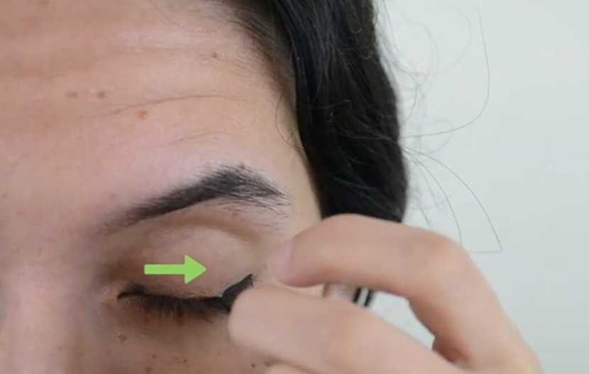 - Подвести веко тёмным лайнером — нужно для того, чтобы скрыть остатки клея на коже.