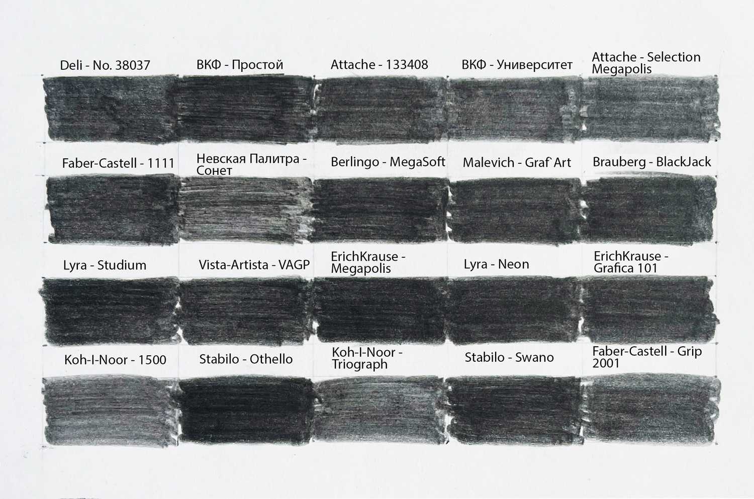 Самый мягкий грифель у Stabilo Othello, а самый твёрдый — у Sonnet от «Невской палитры».