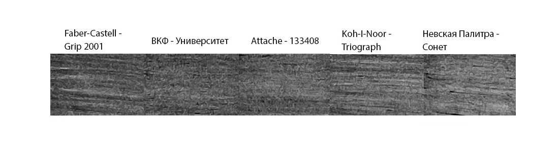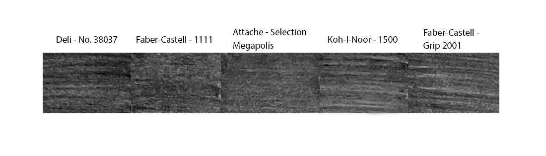 По моему мнению, эти карандаши лучше всего отвечают заявленной мягкости ТМ (HB). Остальные же, которые левее на полоске (не буду перечислять все названия), в основном имеют мягкий грифель.