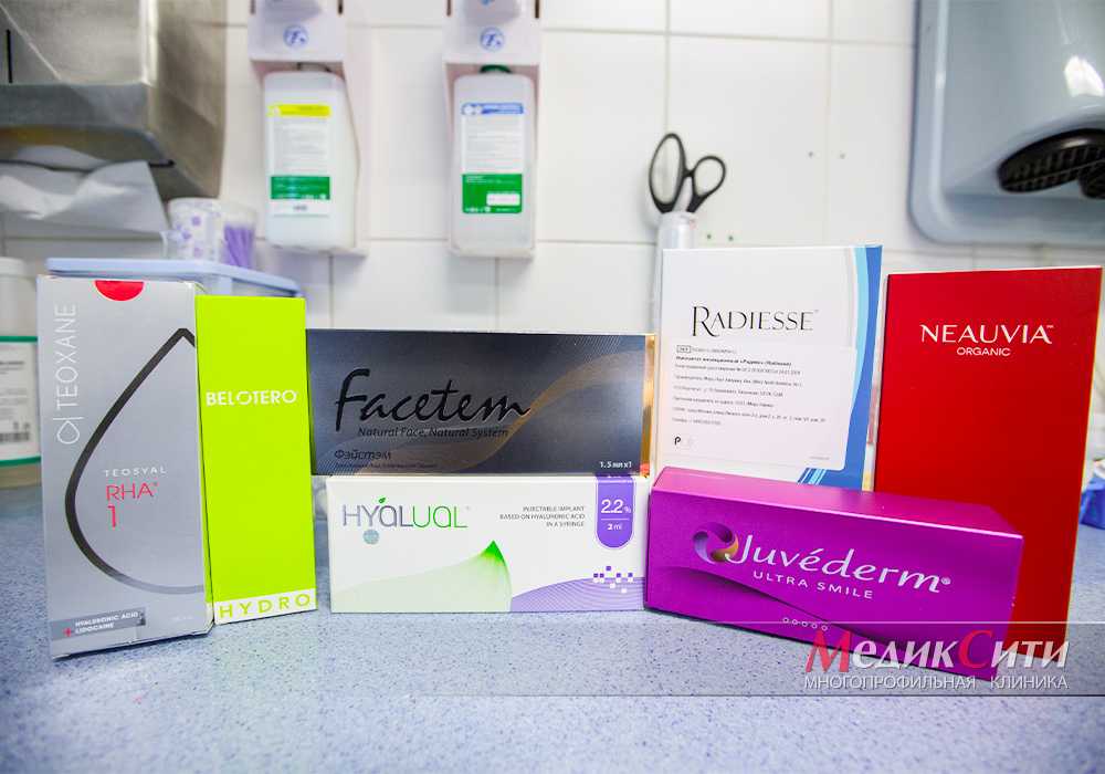 Мы используем препараты Ювидерм (JUVEDERM ULTRA), Профайло (Prophilo), Эстефил (AESTHEFILL), Радиесс (RADIESSE), Суржидерм (SURGIDERM), Принцесс (PRINCESS), Теосиаль (TEOSYAL), жидкие нити Элланс (ELLANSE), Рестилайн (RESTYLANE), Ревофилл (REVOFIL) и др.