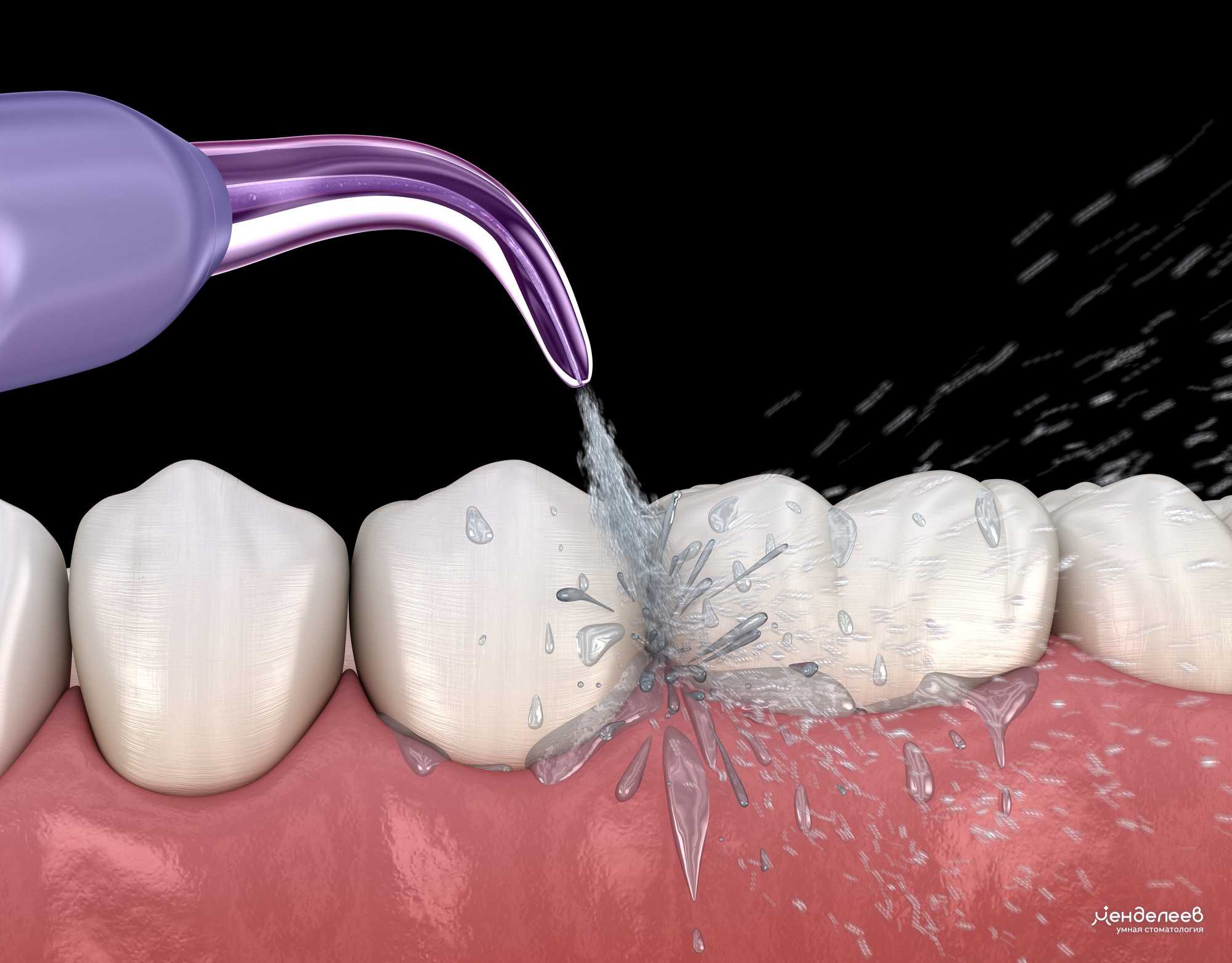 Принцип чистки Аир Флоу: аппарат под высоким давлением подаёт смесь воды, сжатого воздуха и мелкодисперсного абразива (двууглекислого натрия). Абразивные частицы «разбивают» зубные отложения на фрагменты, а вода с воздухом смывает их.