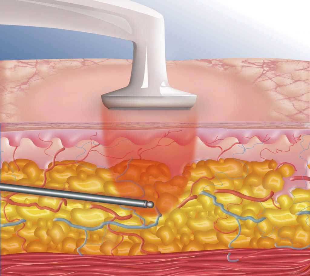 В первую очередь тепловому воздействию подвергается жировая ткань, в результате чего она растапливается и удаляется через канюлю. После удаления жира на ткани вновь направляется радиочастотная энергия, обеспечивающая коже лифтинговый эффект. Под воздействием радиочастот изменяется структура коллагена. Он становится более плотным и лучше поддерживает кожу. То есть кожа становится более упругой.