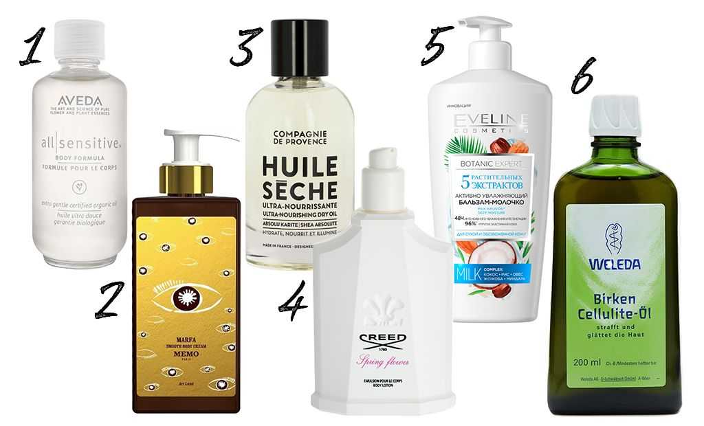 1 — масло для тела Aveda, 2 — крем для тела Marfa с маслом ши, алоэ вера и растительным глицерином, MEMO Paris, 3 — ультрапитательное масло карите для лица и тела Compagnie de Provence, 4 — парфюмированный крем для тела Creed, 5 — увлажняющий бальзам-молочо Eveline Cosmetics, 6 — березевое антицеллюлитное масло Weleda