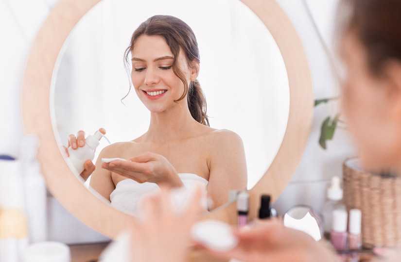 - Очищение. На первом этапе необходимо очистить кожу от себума и удалить отмершие клетки, для этого можно использовать очищающий гель или мицеллярную воду. Вместе с продуктами клеточной деятельности вы удаляете макияж и загрязнения, подготавливая кожу к дальнейшим процедурам.