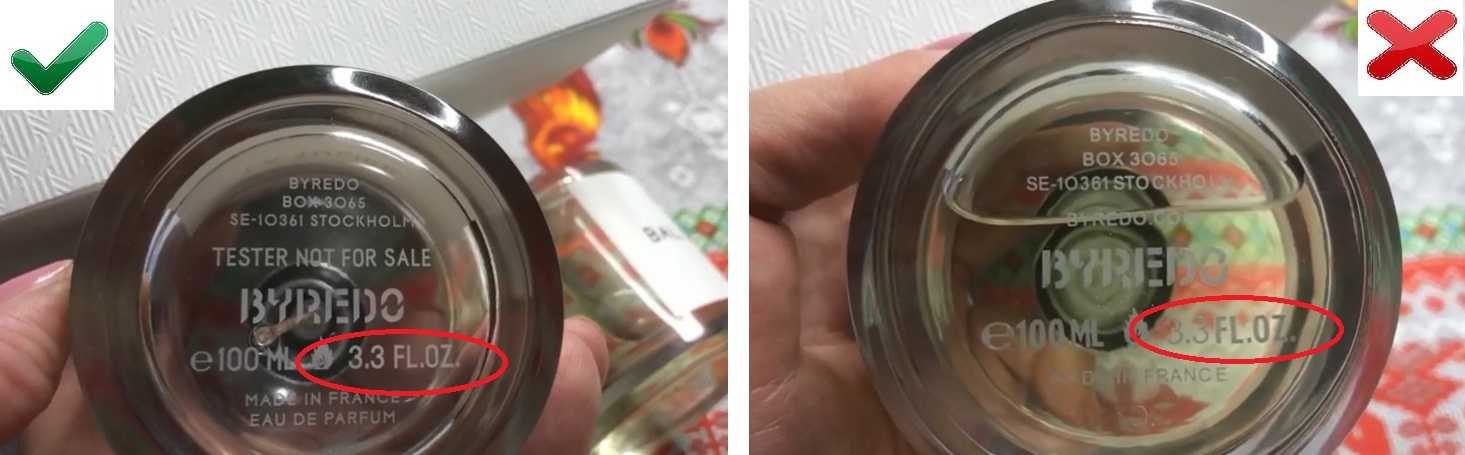 В таких случаях ориентироваться нужно именно на шрифты. Особенно на цифры. На дне флакона есть информация, которую нужно детально рассмотреть. На поддельных духах можно увидеть, что цифры 3.3 написаны другим шрифтом, они тоньше чем маркировка FL.OZ. Толщина цифр, указывающих объем. У оригинальных духов цифры одинаковой толщины, что и буквы. У копии, цифры тоньше.