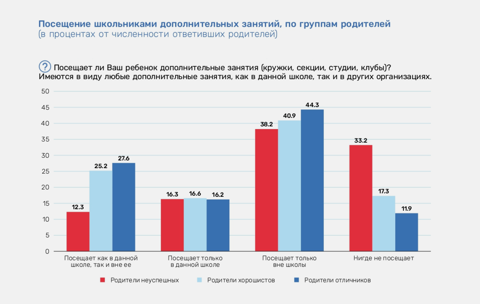 Кстати, половина (49,6%) родителей, вне зависимости от успеваемости их детей, считают, что школы заинтересованы лишь в успешных учениках. А треть (32,6%) и вовсе заявили, что учебные заведения стараются избавиться от детей, которые не справляются с программой или нарушают дисциплину. Причём родители неуспешных учеников соглашаются с этими утверждениями гораздо чаще — 57,4 и 42,3% соответственно.