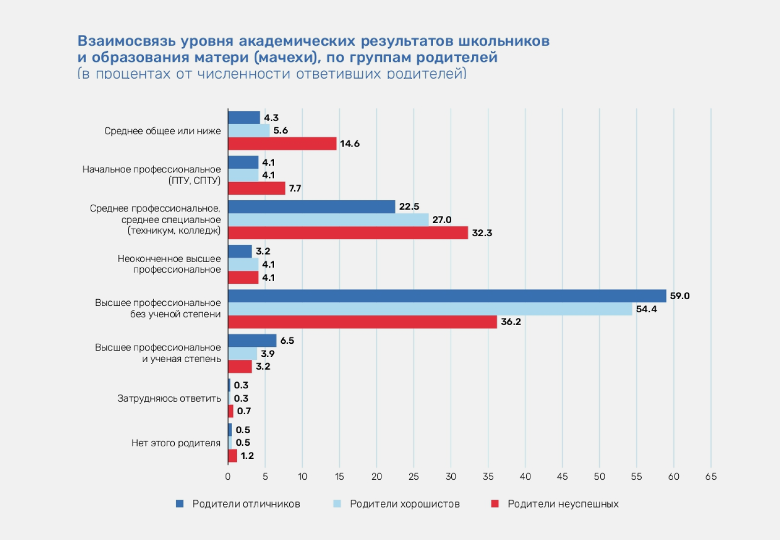 При этом у 14,6% матерей отстающих школьников образование лишь среднее общее и ниже. Среди мам хорошистов и отличников таких менее 6 и 5% соответственно.