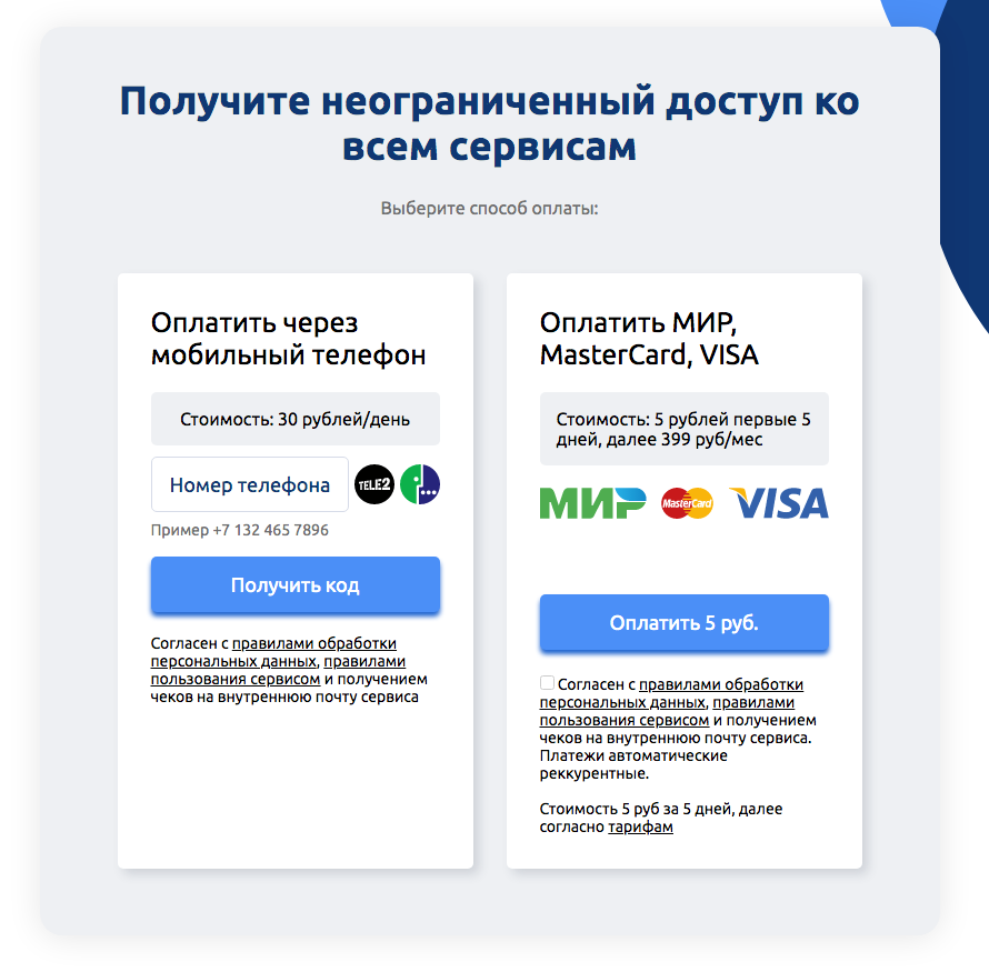 После регистрации, для доступа к сервису, необходимо выбрать способ оплаты. Можно оплатить с баланса мобильного телефона (Теле2, Мегафон) или банковской картой.