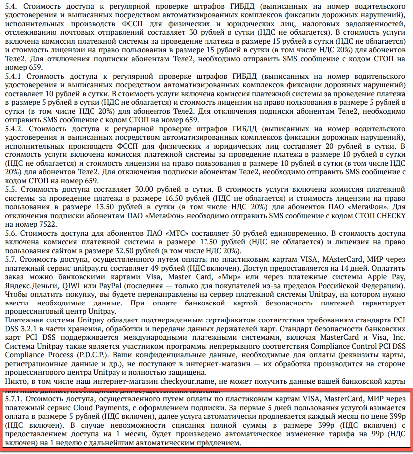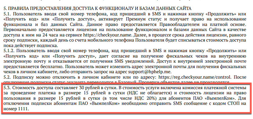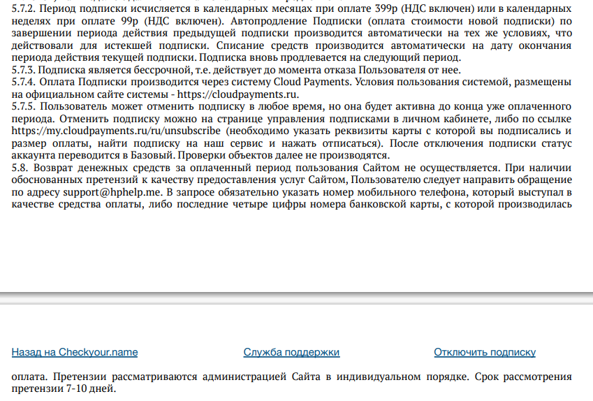 Способ списания средств по подписке от CheckYour.name, является легальным — пользователь самостоятельно подключает платную подписку и разрешает дальнейшие списания по тарифу. Вопросы может вызывать способ донесения информации о подключении подписки, до пользователей не удается довести информацию, что платеж за услуги сервиса является рекуррентным (повторные списания каждый период времени), а не единоразовыми