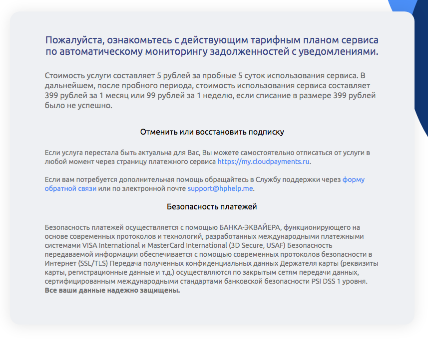 - При оплате картой через платежный сервис CloudPayments — промо-цена 5 рублей за первые 5 дней. Далее будут списывать 399 рублей каждый месяц, а если таких денег на счете не окажется, попытаются списать 99 рублей с продлением доступа на неделю. Таким образом доступ за 399 руб. — при оплате раз в месяц, 99 руб. — при оплате раз в неделю.