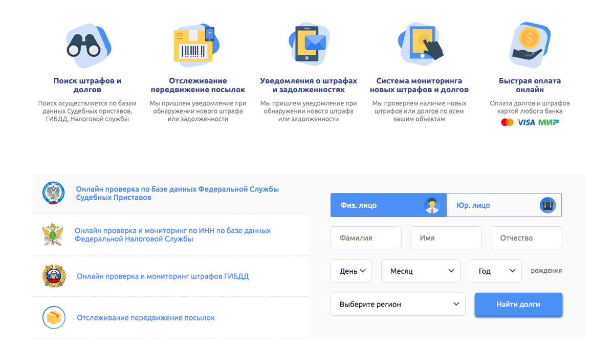 - Пользователь попадает на главную странице сервиса CheckYour.name, здесь предлагается произвести регистрацию в сервисе автоматизированного мониторинга для поиска штрафов и задолженностей, а также отслеживания посылок.