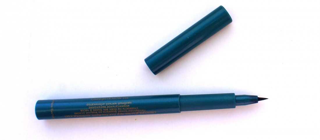 Описание: Является самым бюджетным продуктом в списке, однако, это нисколько не влияет на качество. Производители сделали довольно твёрдую кисточку, позволяющую легко варьировать толщину стрелок. Но она не доставляет дискомфорта при нанесении и не царапает нежную кожу век. На верхнем веке смотрится ярко и долго держится не размазываясь, но не стоит наносить на нижнее веко иначе подводка потеряет свою стойкость. Цвета: черный, серый и коричневый.