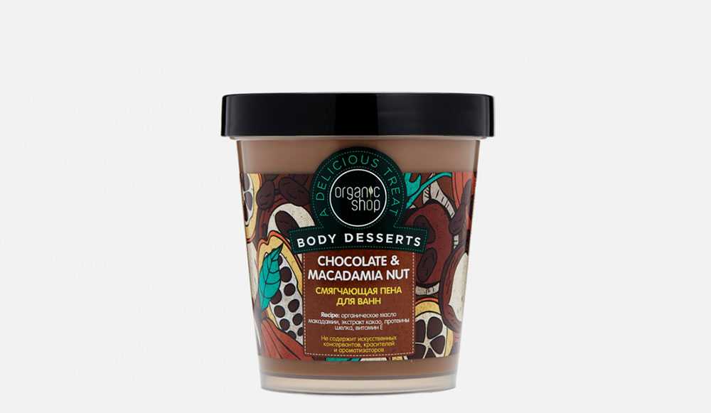 Оригинальная пена Chocolate & Macadamia Nut, Organic Shop превратит обычный прием ванны в настоящее чувственное удовольствие. Характерный аромат шоколада и ореха макадамии дарит ощущение полной релаксации, снимает накопившееся напряжение и дарит самые позитивные эмоции. Пена обогащена витаминами, минералами, натуральными маслами, увлажняющими кожу и обеспечивающими должный уход.
