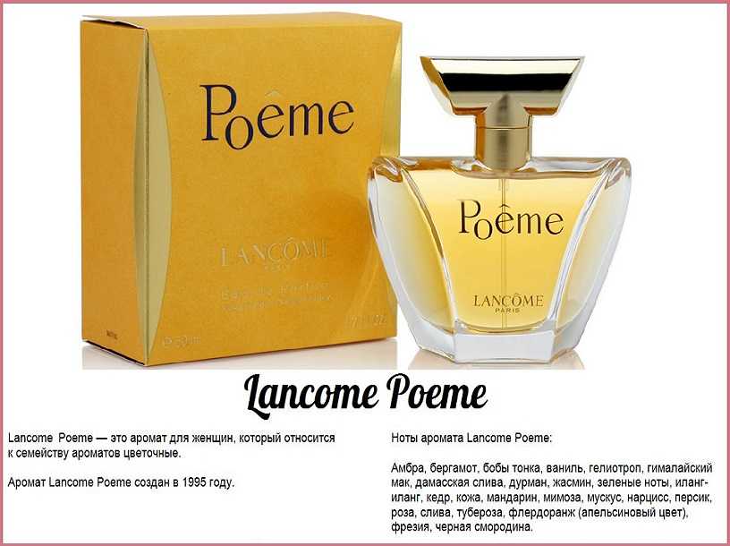 Poeme Lancome – цветочно-фруктовый аромат с терпким ванильным шлейфом. Сильный и громогласный аромат заполняет собой все пространство и очаровывает любого, кто попадает под его воздействие.