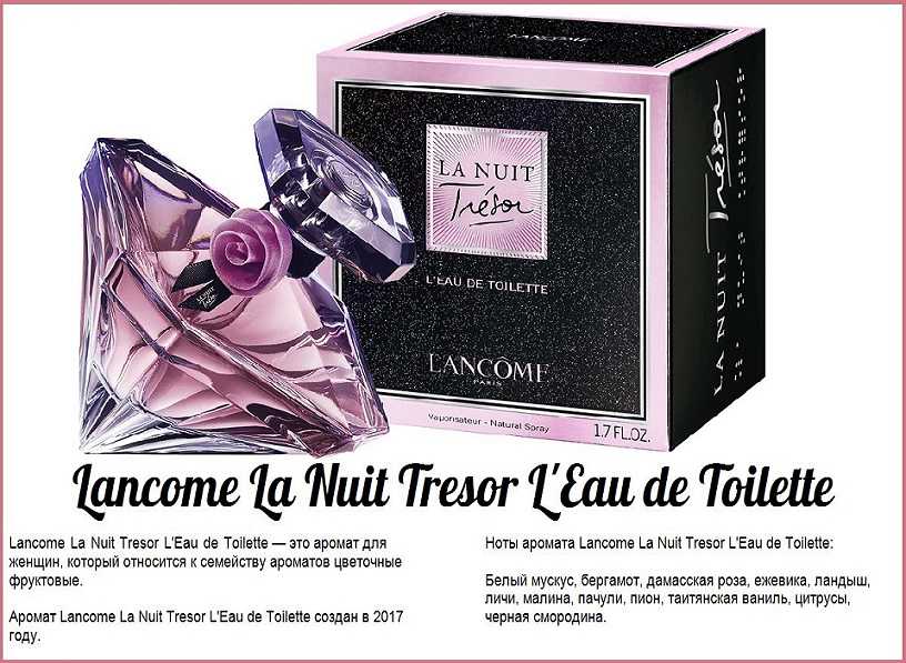 Lancome La Nuit Tresor L’Eau de Toilette – стойкий и насыщенный аромат, наполненный кондитерской сладостью. Легкие восточные мотивы идеально подойдут для прохладного времени года.