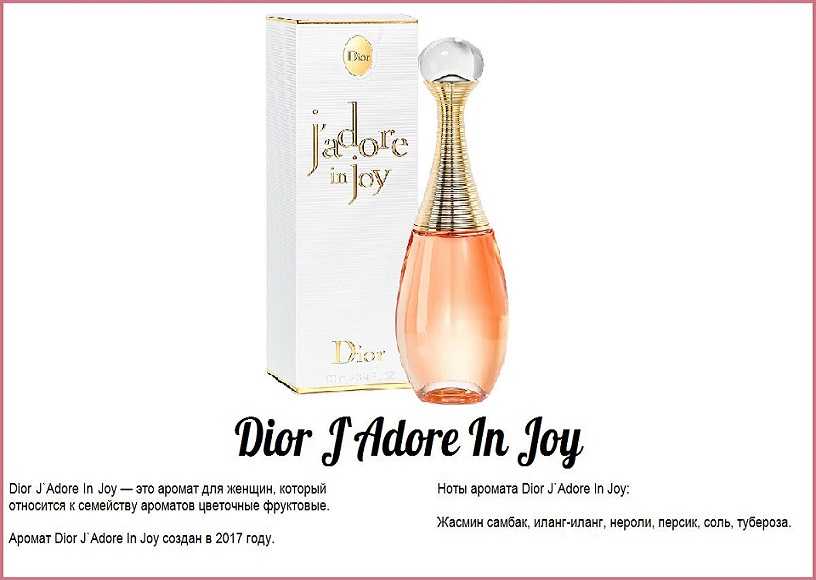 J’adore In Joy – туалетная вода с восклицательными фруктовыми аккордами. Описание аромата близко к привкусу игристого шампанского с фруктовым ассорти. Неповторимая солоноватость делает запах оригинальным и неповторимым.