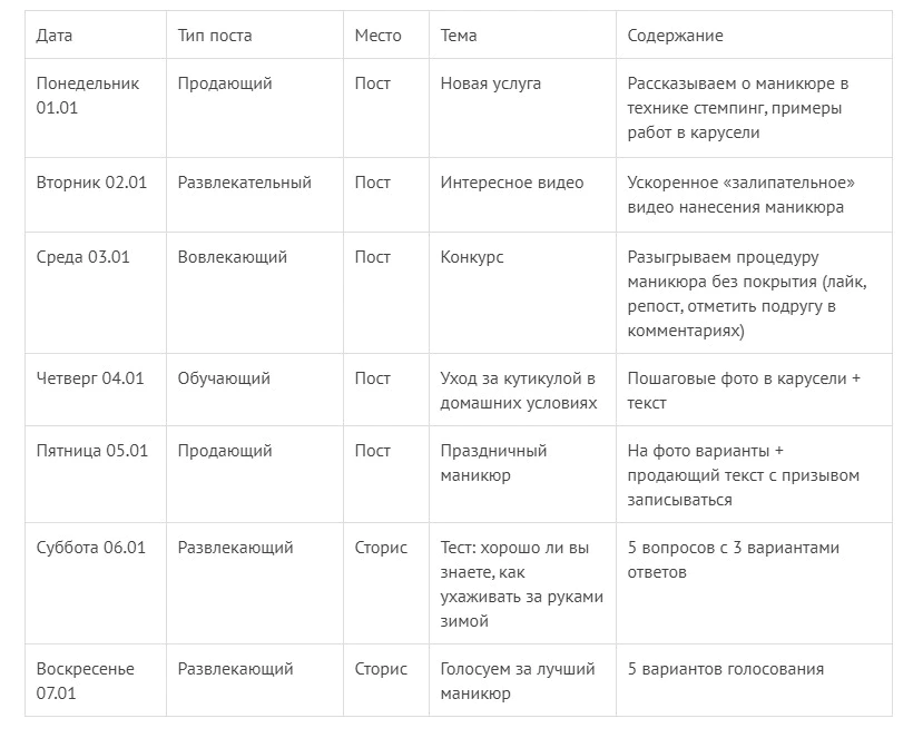 Для составления контент-плана вы можете использовать готовые шаблоны или взять обычные таблицы в Excel или Google. Установите частоту публикаций – от трех до пяти в неделю, пропорцию продающих по отношению к информационным – примерно 1 к 4, и тип контента (сторис, фото или видео). Ниже приведен пример контент-плана в Инстаграм для мастера ногтевого сервиса: