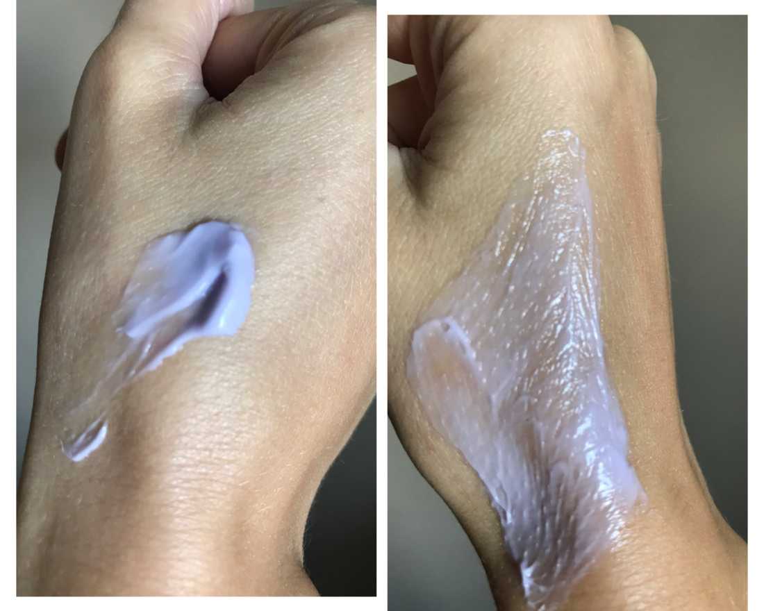 Маска имеет кремовую, однородную консистенцию, похожую на жирненький увлажняющий крем. Цвет маски дублирует цвет баночки, он нежно лавандовый.