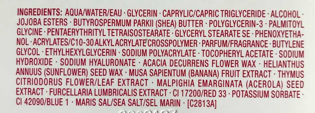 Активные компоненты, которые заявляет производитель — это экстракты органического зеленого банана и лимонного тимьяна, которые будут способствовать возвращению эластичности и упругости, а также заставят нашу кожу сиять, а пальмитоил глицин (почему-то производитель именно этот компонент выделяет из всего состава) будет сглаживать наши морщинки/заломы, образовавшиеся в результате напряжения мышц лица.