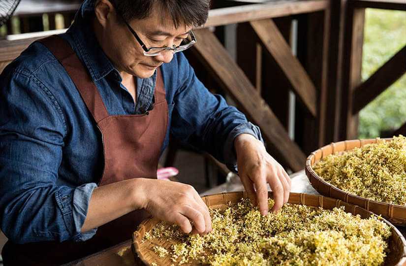 Родина османтуса – Поднебесная, а точнее провинция Гуанси-Чжуань на юго-востоке. Чай традиционно заваривают именно там, и называется он Гуй Хуа Ча. Для его приготовления используют сырье с лучших чайных кустов, в качестве ароматизатора выступают цветы растения, которые собирают руками. Затем сырье сушат, вялят, листья скручивают для выделения сока, прдающего напитку аромат и вкус. Ферментация мощная, поэтому напиток сохраняет все полезные свойства золотого османтуса.