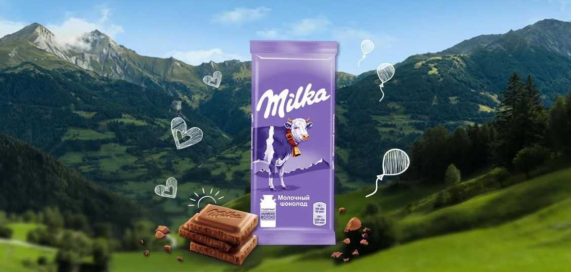 В центре легенды о шоколаде Milka находится выдуманный персонаж — фиолетовая корова. Она живёт под голубым небом и пасётся на заливных альпийских лугах, поэтому её молоко делает шоколад нежным. Эта вымышленная история интересно и приятно преподнесена потребителям.