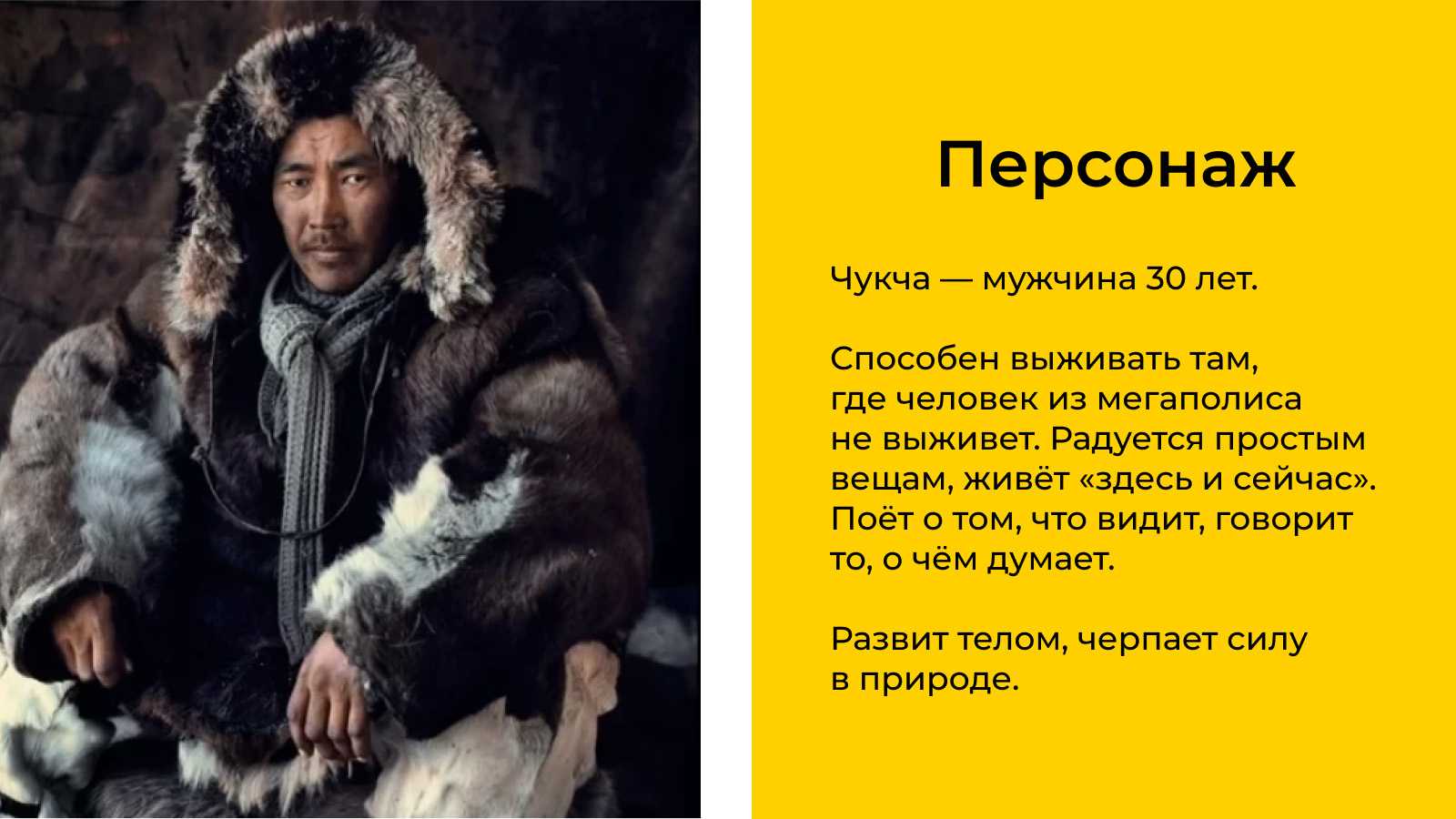 Например, миссия бренда одежды для любителей экстремальных видов спорта «Чукча» — быть примером осознанного отношения к себе, другим людям и природе. Персонажем бренда стал Чукча: в переводе с чукотского — «настоящий человек». Герой одет в широкий балахон и штаны. Похожую одежду носят лыжники и сноубордисты. Он умеет радоваться простым вещам, близок к природе и отражает ценность бренда — природосообразность