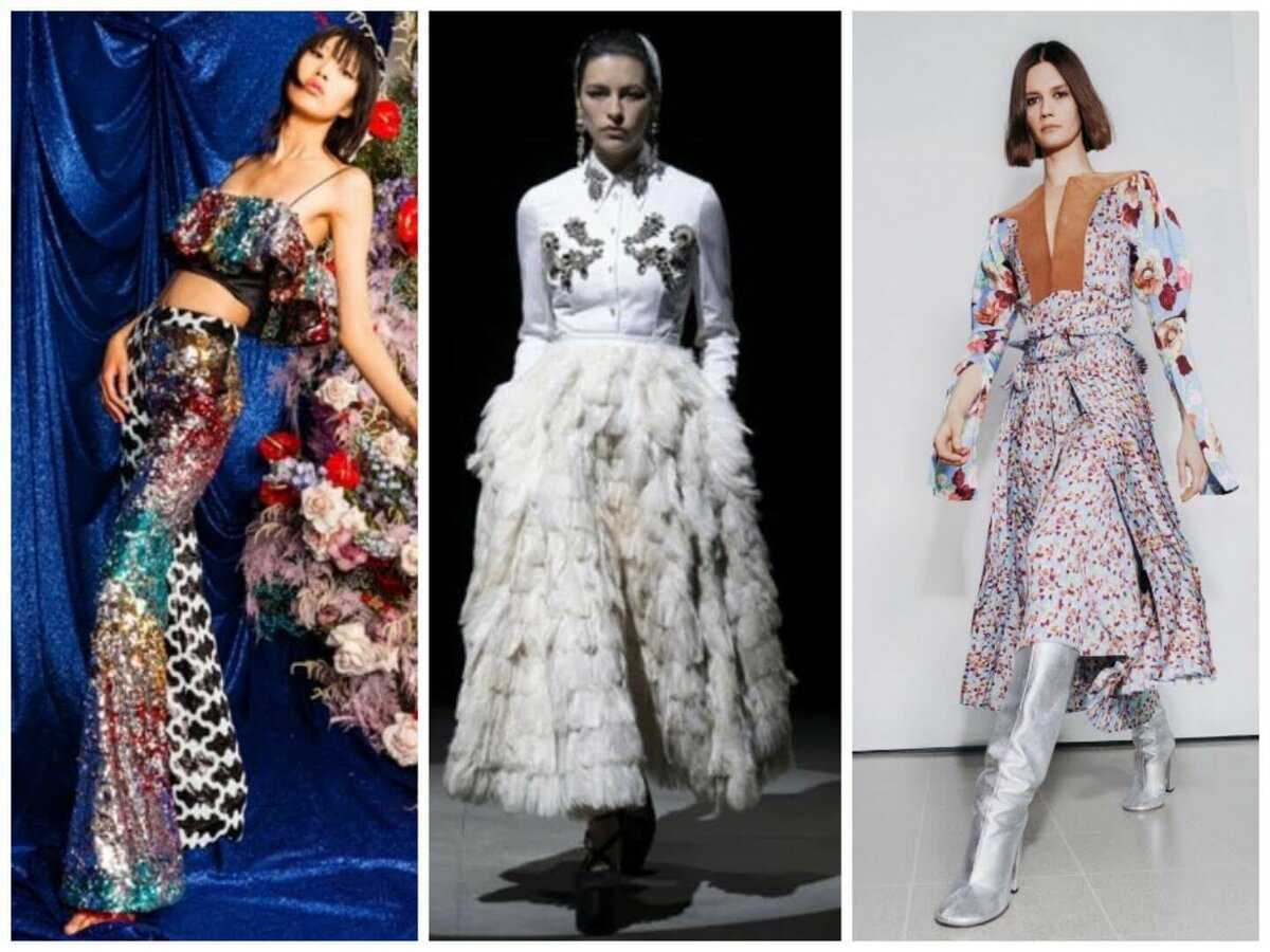 В коллекциях было много объёмных платьев, как у принцесс из сказок и дам прошлых веков (Roksanda, Simon Rocha, Molly Goddard, Erdem), клетка, как на шотландских юбках (Coach, Molly Goddard, Vivienne Westwood), цветочные, анималистичные и графические принты и надписи и их сочетание (Erdem, Yuhan Wang, Victoria Beckham, Natasha Zinko, Halpern), оборки (Simone Rocha, Bora Aksu, Molly Goddard), высокие каблуки и платформа (Vivienne Westwood, Molly Goddard), блестящие наряды ( Halpern), перья (Erdem), кожаные комбинезоны и костюмы (16Arington), вырезы (Vivienne Westwood), искусственный мех (Anna Sui).
