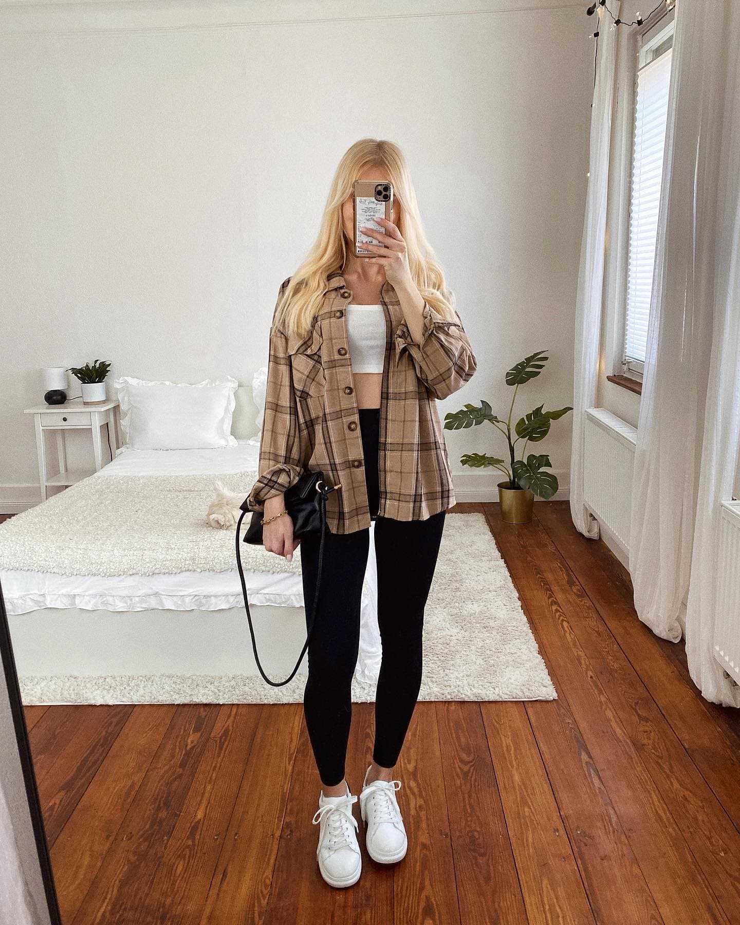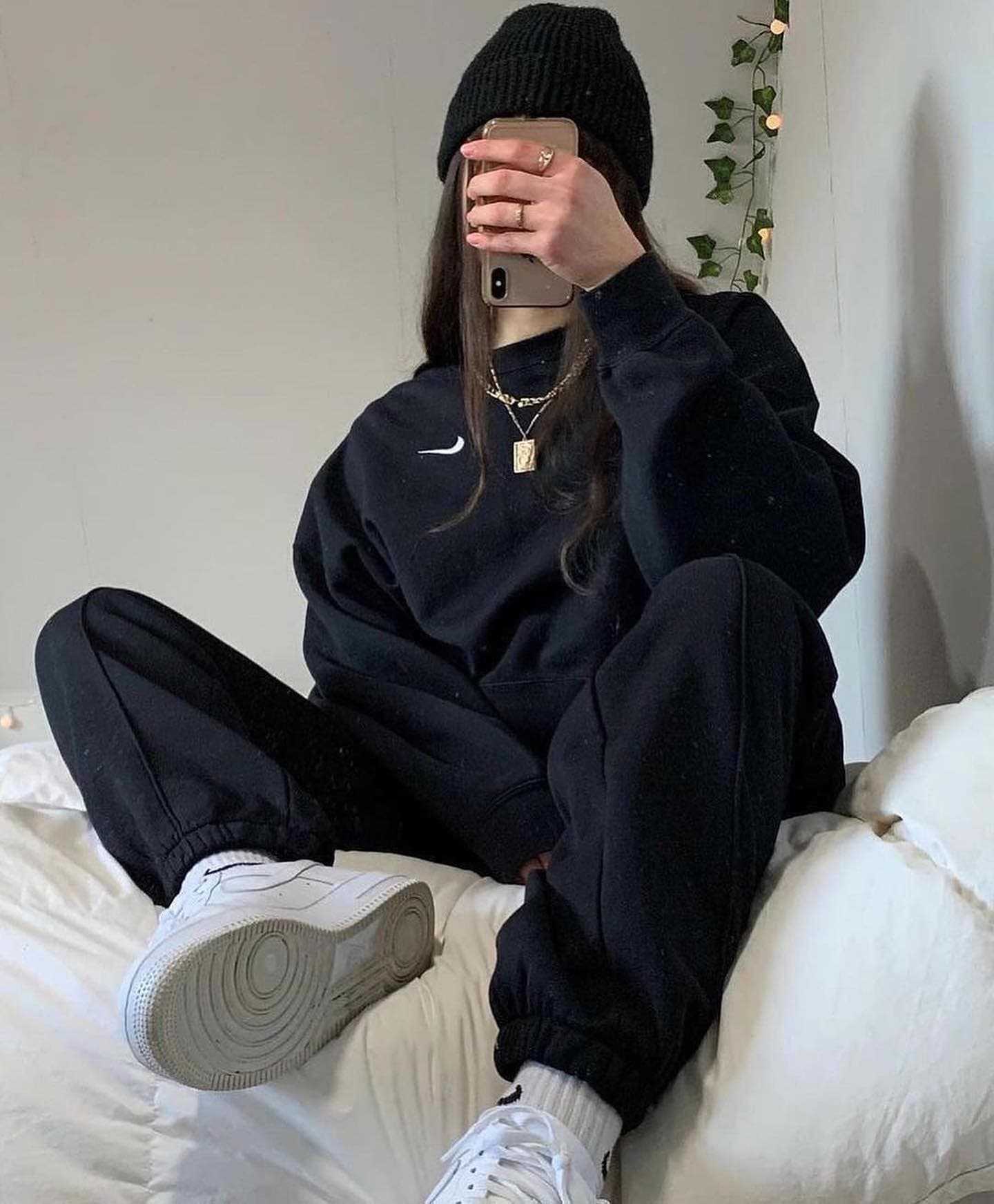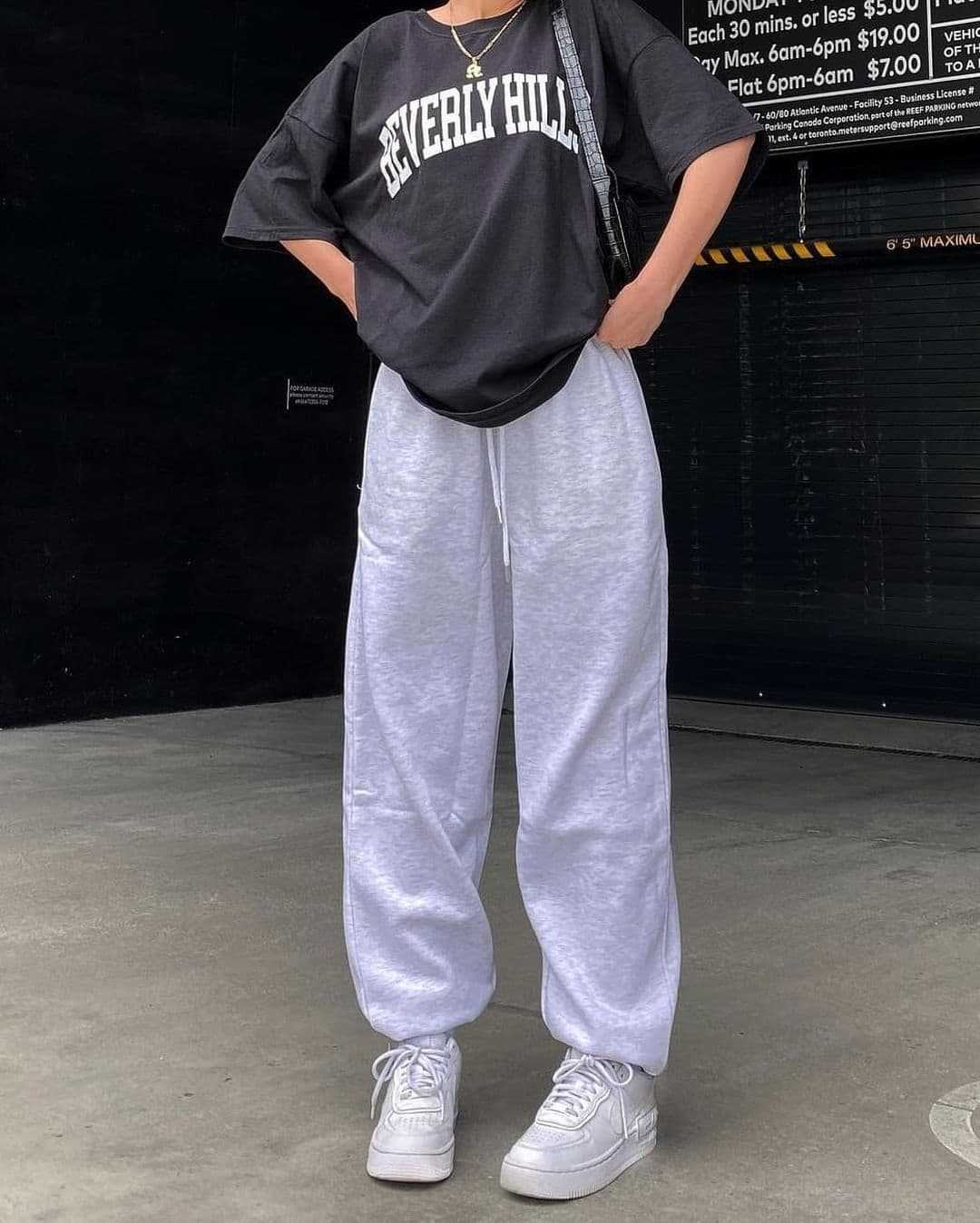 В рейтинге модной одежды для девушек-подростков до 16 лет и старше всегда фигурируют спортивные штаны: они должны быть просторные и объемные с резинкой на щиколотках. Чаще всего в стильных образах можно увидеть серые “бананки”. Такие штаны лучше всего смотрятся с толстовкой oversize, просторной футболкой или гольфом.