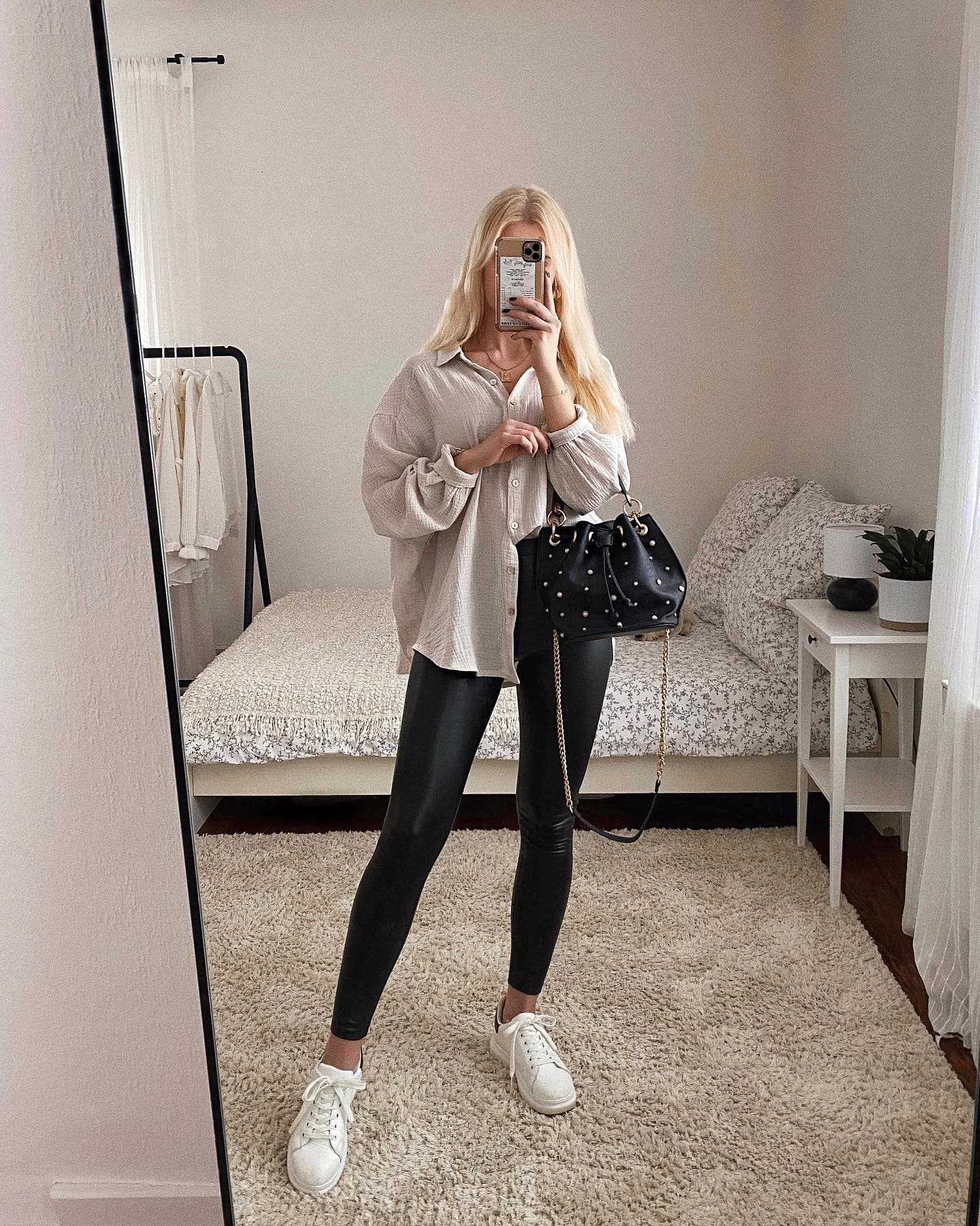 Смело надевайте белые футболки парня со своими джинсами «мом». Носите его худи и бейсболки с любимыми леггинсами. В 2022 году такие миксы особенно актуальны. Однако помните: женственность должна быть естественной, поэтому никаких длинных ногтей, ярких лаков и броского макияжа.