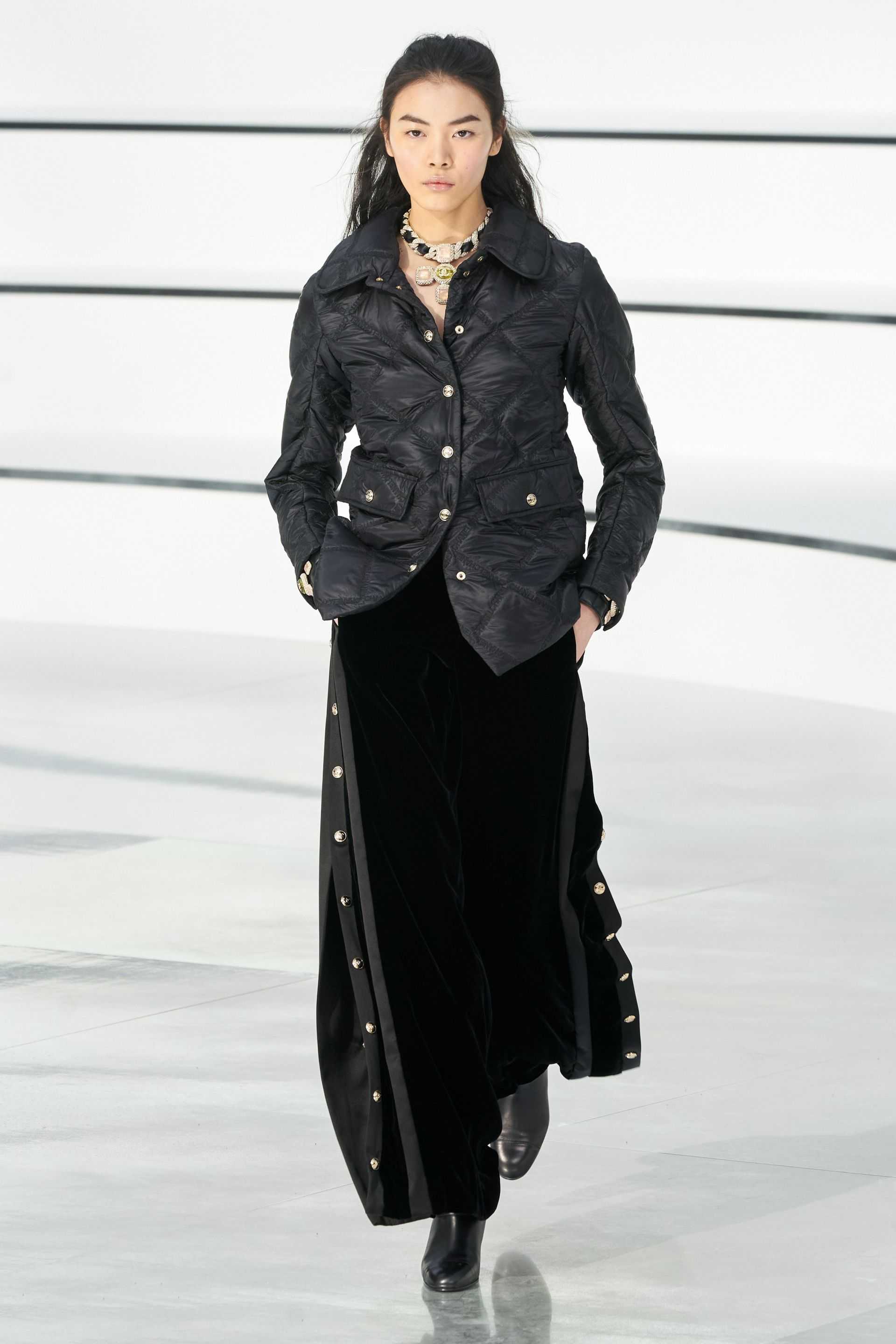 Более элегантный вариант стеганой куртки можно увидеть на показе Chanel осень-зима 2021: пуговицы-заклепки и накладные карманы акцентируют внимание на себе, делая верхнюю одежду сложнее и интереснее. Носить такую куртку можно с чем угодно: с ультрамодными ботфортами, платьем-колонной или с кожаными шортами и свитером крупной вязки. Фото: Chanel осень-зима 2020–2021