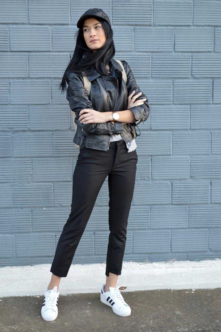 - кожаная куртка (идеальный вариант для теплой осени, замечательно сочетается с классическими и узкими джинсами, брюками-кюлотами и простого кроя платьями средней длины);