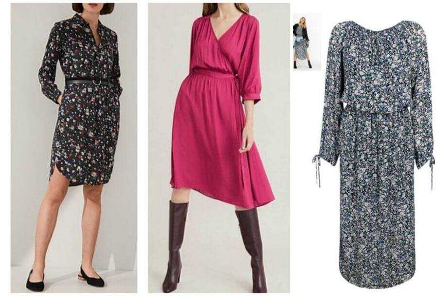 - Средней длины, собранные по талии, платья с длинными рукавами — особенно из хлопчатобумажных тканей (см. фото). Вы найдете версии с цветочными принтами (особенно с темным фоном), с принтами животных и текстурированными однотонными цветами. Этот стиль работает лучше всего на женщинах с четко выраженной талией и небольшим животиком.