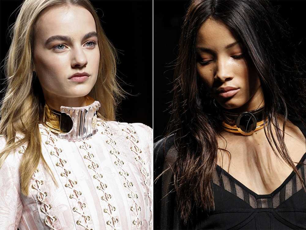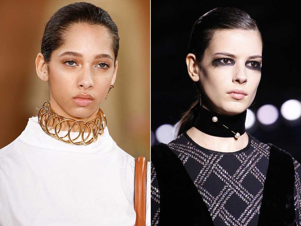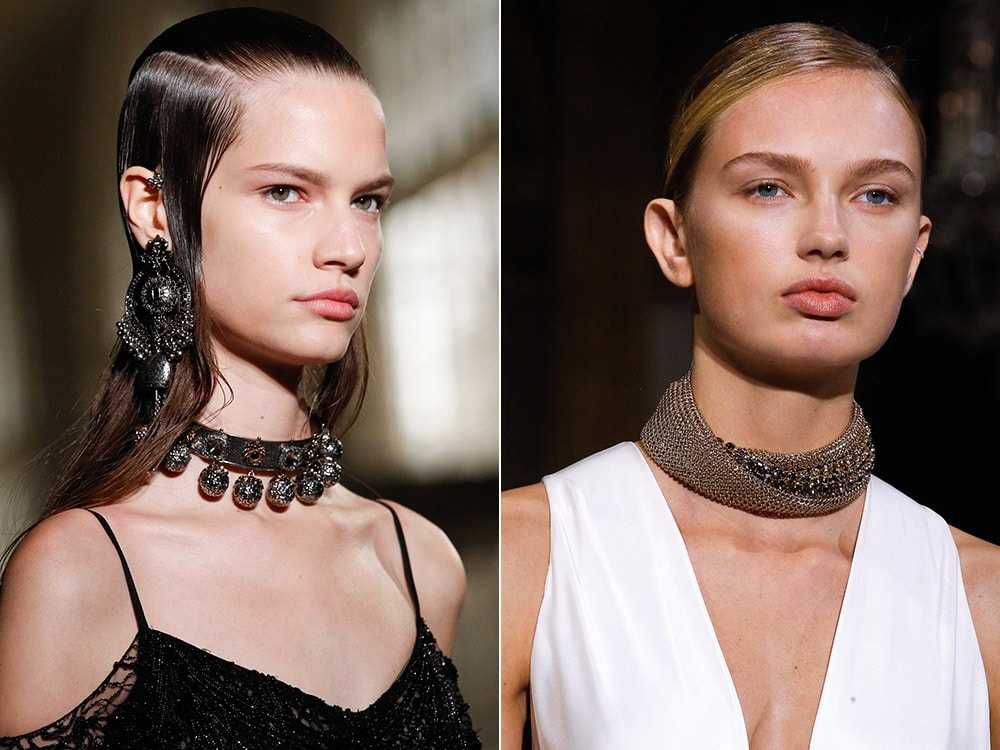 Уже который год подряд на модных показах дизайнеры представляют чокеры. Это крупные колье, плотно обволакивающие шею. Вариантов дизайна может быть масса – узкие, широкие, металлические, текстильные, пластиковые, тоненькие с бусинами или многоярусные.