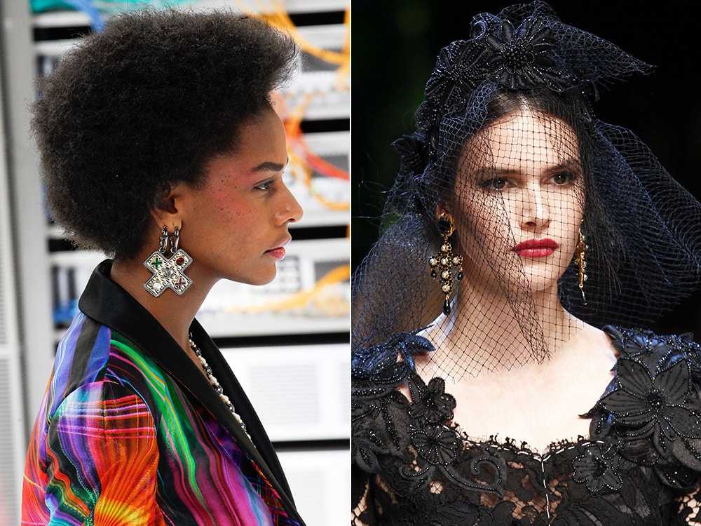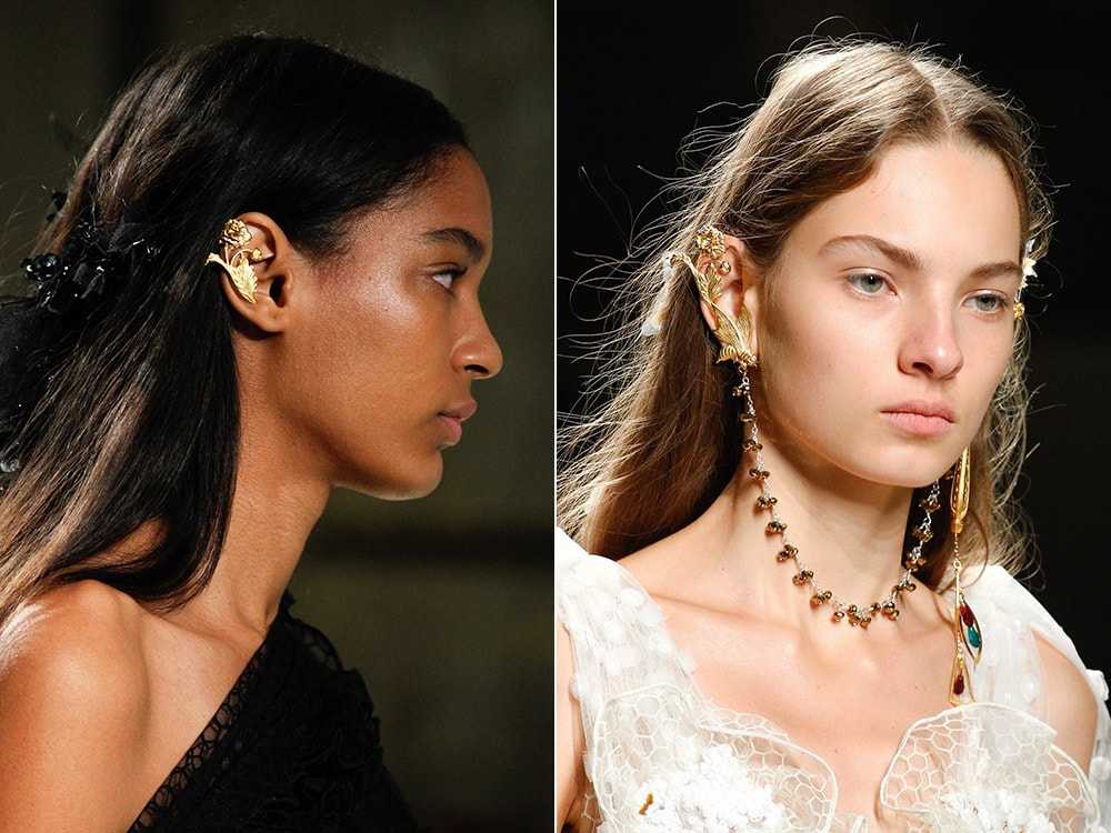 Вполне приемлемы смелые сочетания пусетов и серьг-колец, гвоздиков и серьг-люстр. Некоторые бренды возродили забытые каффы в форме цветов и веток. Их можно носить с другими сережками, а можно украсить только одно ухо.