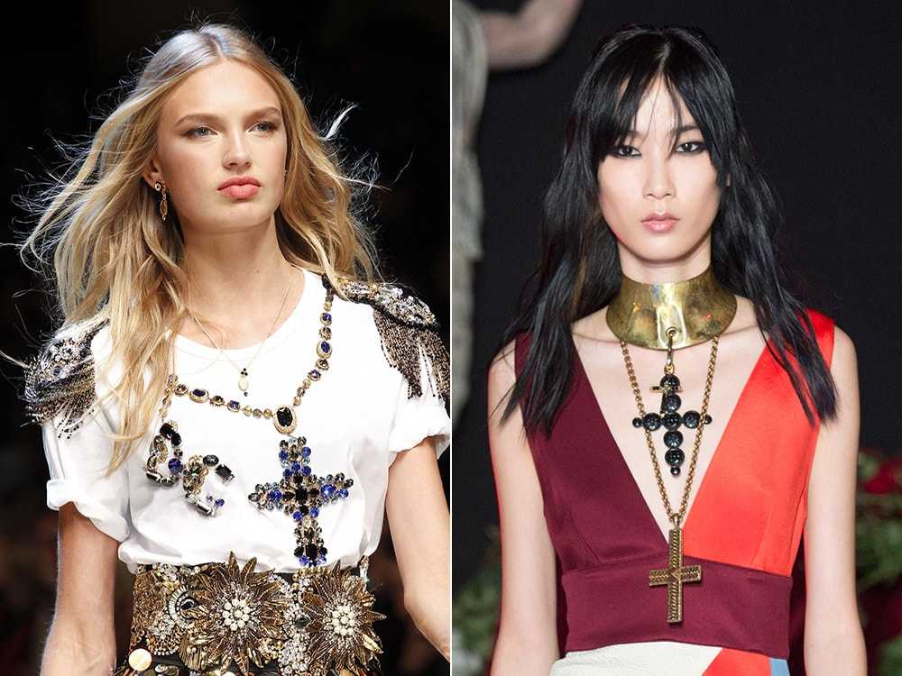 Элементы крестов стали ключевой деталью украшений весенне-летнего сезона. Чокеры, подвески, серьги с крестами ныне актуальны не только в готическом направлении – подобные украшения носят первые модницы в качестве яркой детали повседневного образа. Изделия с крестами могут выглядеть торжественно, когда декорированы цветными камнями, а могут смотреться весьма лаконично без излишеств.