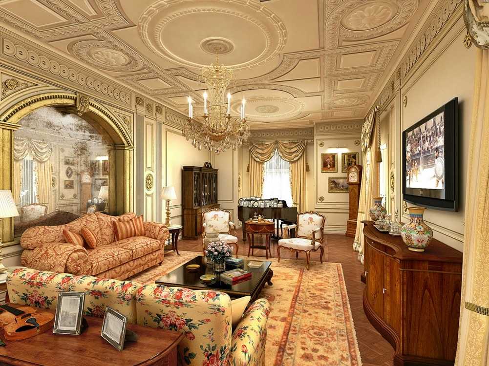 Для помещений, оформленных в стиле ренессанс, характерны сводчатые высокие потолки. Уместно здесь смотрятся многоуровневые конструкции, украшенные в центре орнаментом, рисунком или позолоченной лепниной.