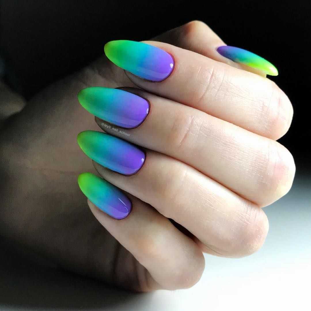 Созданный отдельно для каждого ноготка дизайн с уникальным переходом цветов – одно из самых креативных решений, особенно, если оттенки скомбинированы верно.