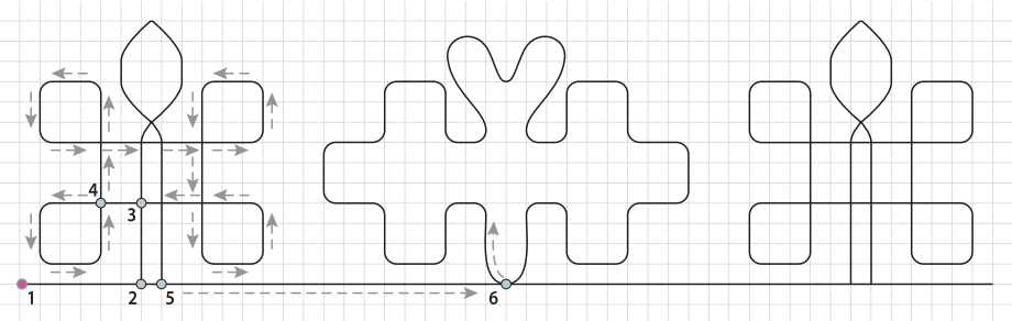 - В точке 3 выполните поворот влево и вышейте квадраты (от точки 4), работая по стрелке.