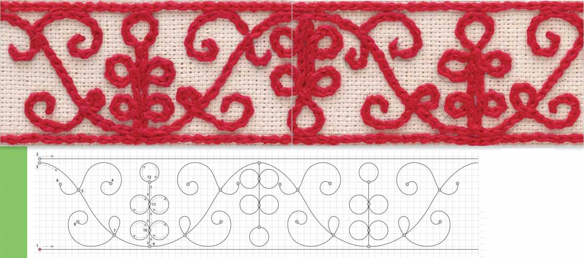 - Выполните тамбурные швы по краям орнамента (от точек 1 и 2).