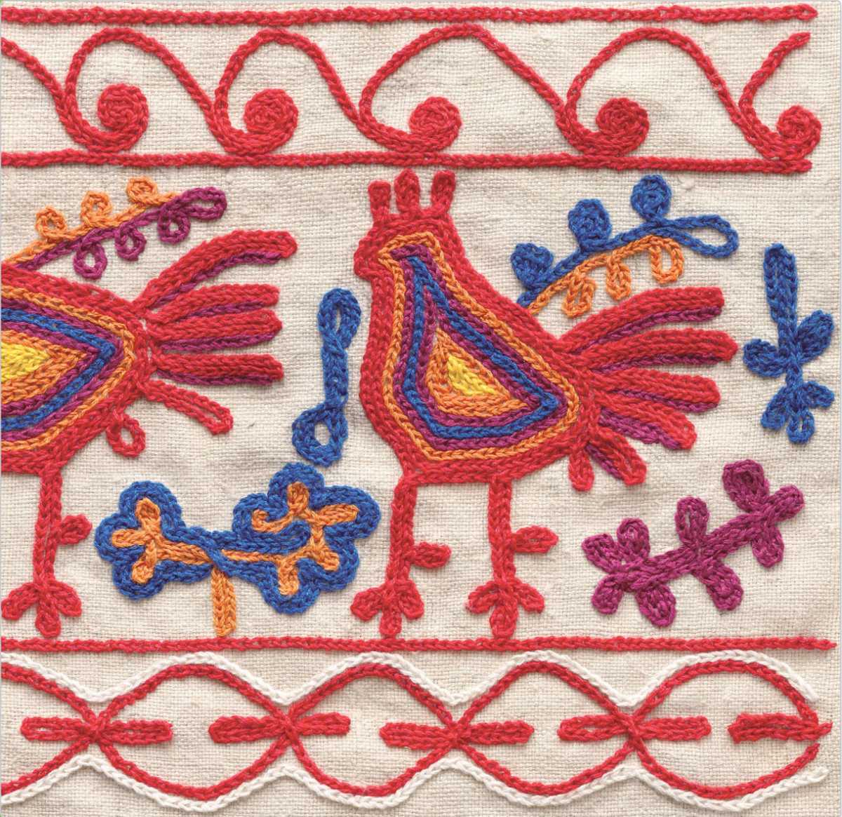 Тамбуром вышивали на холсте шерстяными нитками разных цветов. Этот способ создания рисунка характерен и для северных губерний. Это фрагмент вышивки из Тверской губернии.