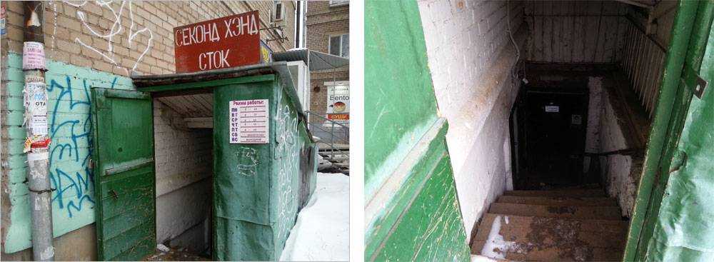 Типичный вход в плохой секонд-хенд: подвал, обшарпанные двери, грязь