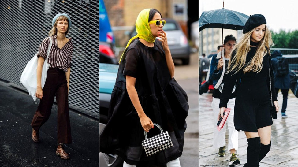 Помимо классики, с этим головным убором допустимы практически все сочетания сумок и обуви.