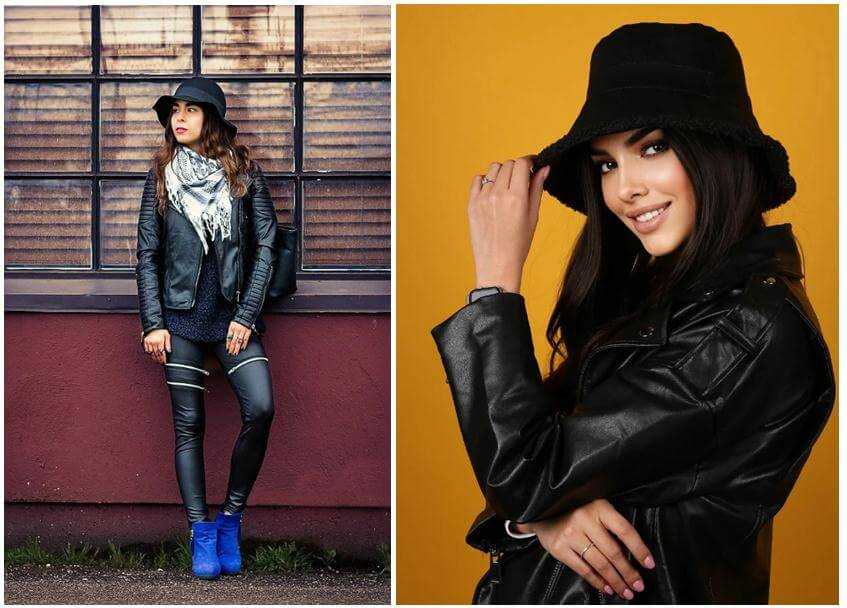 Косухи уже давно перестали быть «униформой» бородатых байкеров. Сейчас это одежда унисекс, которая уже не первый год остается на пике популярности. Как ни странно, но панамы из кожи не особо подходят под эти брутальные куртки. Гораздо интереснее и элегантнее с ними смотрятся шляпки из ткани, плюша и экомеха.