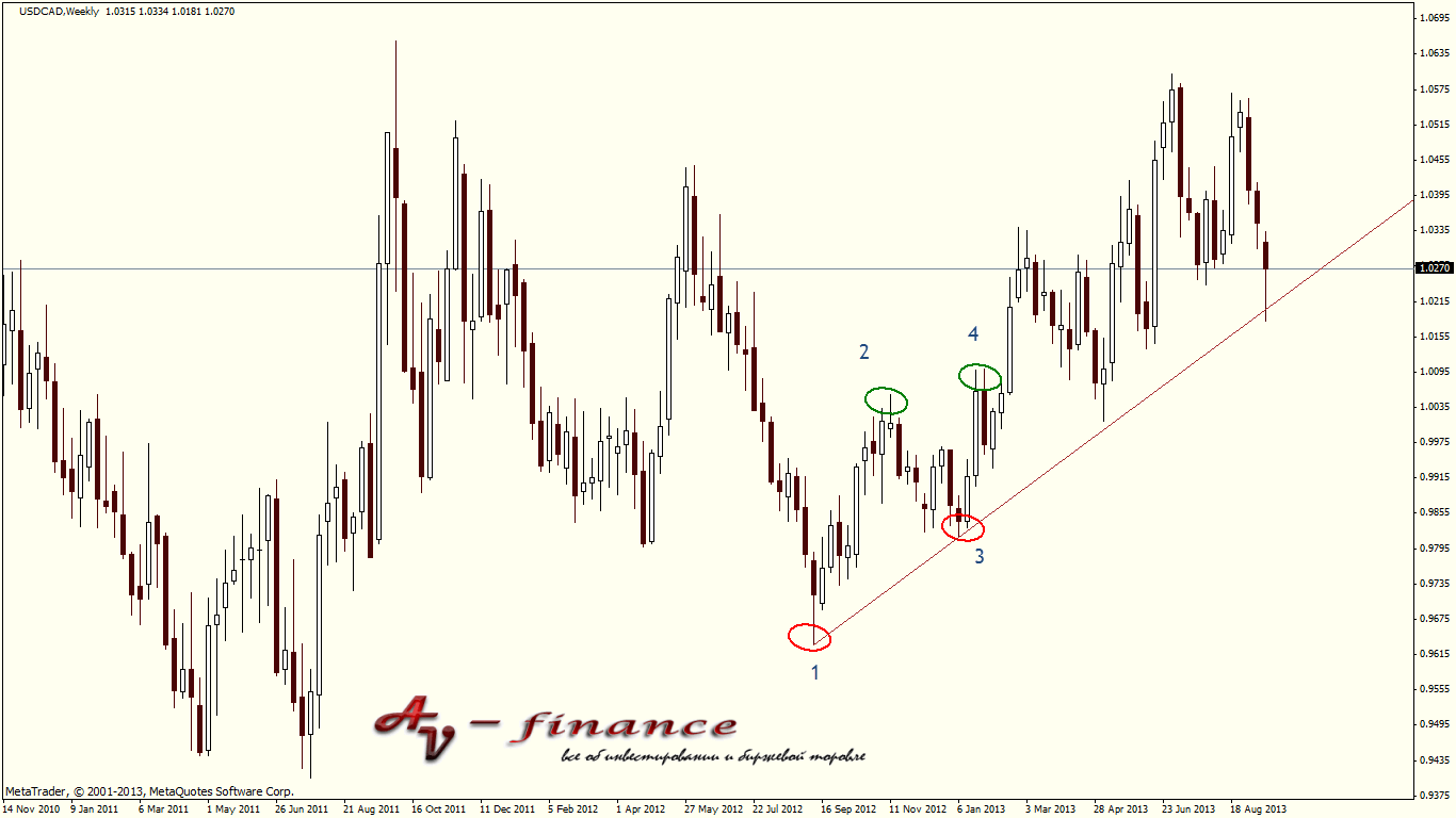 Это недельный график валютной пары USDCAD. Перед началом технического анализа необходимо сделать две вещи: определиться с тайм-фреймом (что я и сделал) и выбрать точку отсчета (я взял минимум от 09 сентября).