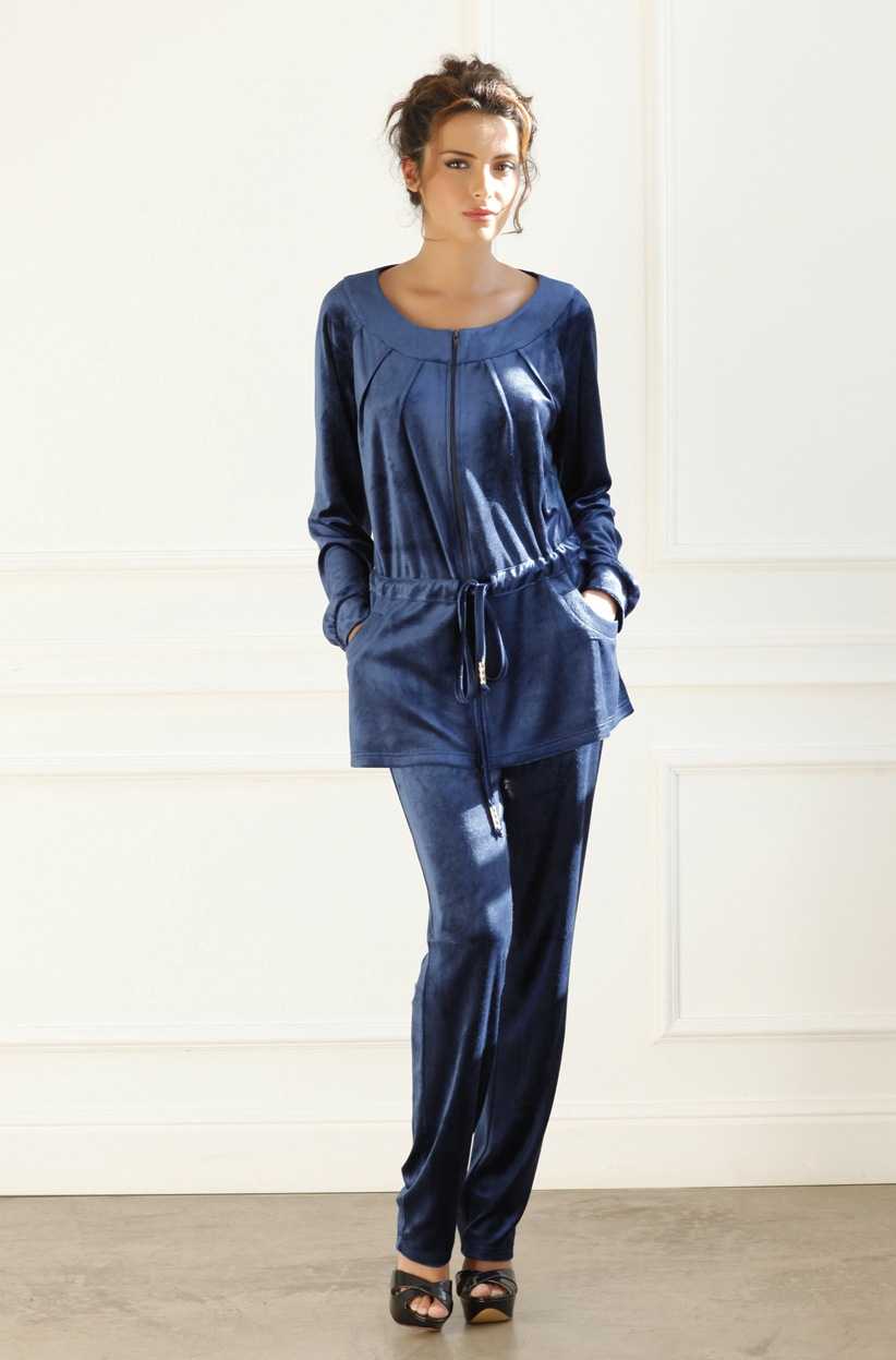 Для осени, зимы и весны подойдут костюмы с брюками из велюра, трикотажа. В них удобно заниматься домашней работой.