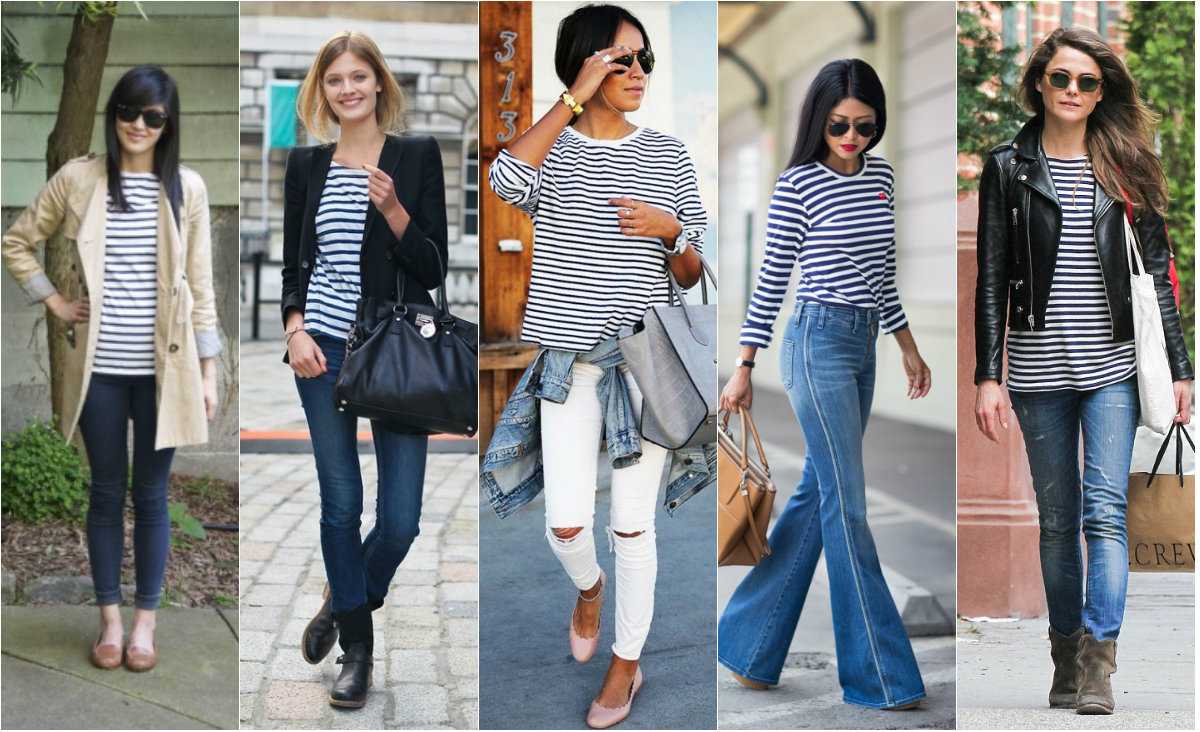 Это самое логичное сочетание, которое напрашивается само собой. Но в рамках его возможно множество вариаций. Например, рваные потертые джинсы, сумка-баул, белые кеды, тельняшка и матросская шляпа – это отличный летний комплект для прогулки. Ансамбль из другой оперы: джинсы-скинни, лодочки на каблуке, тельняшка, клатч. Этот комплект уже не имеет ничего общего с веселой пираткой, как предыдущий. Напротив, он женственный и элегантный.